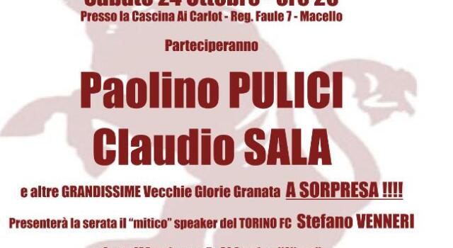 Una nuova, bellissima iniziativa del Toro Club Macello, che organizza una “Cena con i Campioni”. Il prossimo 24 ottobre, alle ore 20 e alla Cascina dei Carlot, ci saranno tantissime vecchie glorie granata, tra cui gli indimenticabili Paolo Pulici e Claudio Sala. Due ore prima, alle 18, invece, ci sarà la presentazione del libro “Caro Toro ti scrivo”, scritto da Giorgio Merlo e Fabio Viglione. La serata sarà presentata dallo speaker del Toro, Stefano Venneri. Per le prenotazioni, chiamare i numeri 339 4712807- 335 5957820.