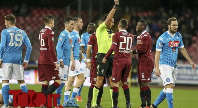 Al 47’ il primo cartellino giallo della ripresa ai danni di Baselli è quantomeno discutibile ed esagerato, anche in considerazione del metro sin lì adottato: il giovane centrocampista granata è infatti ammonito per un tocco impercettibile su Callejon che sentendosi toccare stramazza al suolo. Al 58’ Glik è costretto ad intervenire fallosamente su Higuain al limite dell’area e l’arbitro lo ammonisce; sul susseguente calcio di punizione, Insigne colpisce la parte alta della traversa ma arbitro e collaboratori vedono un’inesistente deviazione di Padelli e concedono il calcio d’angolo. Al 72’ ammonito anche Bovo per un intervento in ritardo su Mertens mentre al 75’ rischia anche Vives (graziato) per una trattenuta. Al 78’ Di Bello è fiscale ai limiti dell’eccesso allontanando dal terreno di gioco i due tecnici: Sarri per aver oltrepassato l’area tecnica e Ventura per aver dato un pugno alla panchina dopo un errore di Bovo! All’86’ infine ammonito giustamente Albiol per proteste.