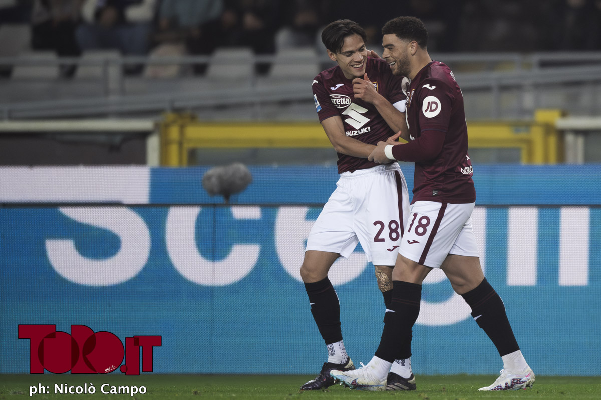 Che Adams of Torino FC celebrates with Samuele Ricci of Torino FC after scoring the opening goal during the Serie A football match between Torino FC and Cagliari Calcio.
