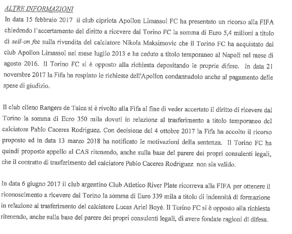 Come lo scorso anno, il vecchio club di Maksimovic, l’Apollon Limassol, ha chiesto un ingente premio di valorizzazione al Torino, che ha vinto il ricorso. Caso simile anche per Boyé. Querelle internazionale per Caceres: il Toro dovrà pagare 350mila euro, ma chiede il ricorso