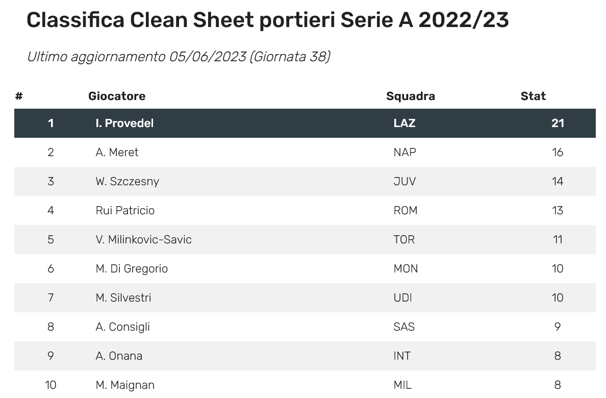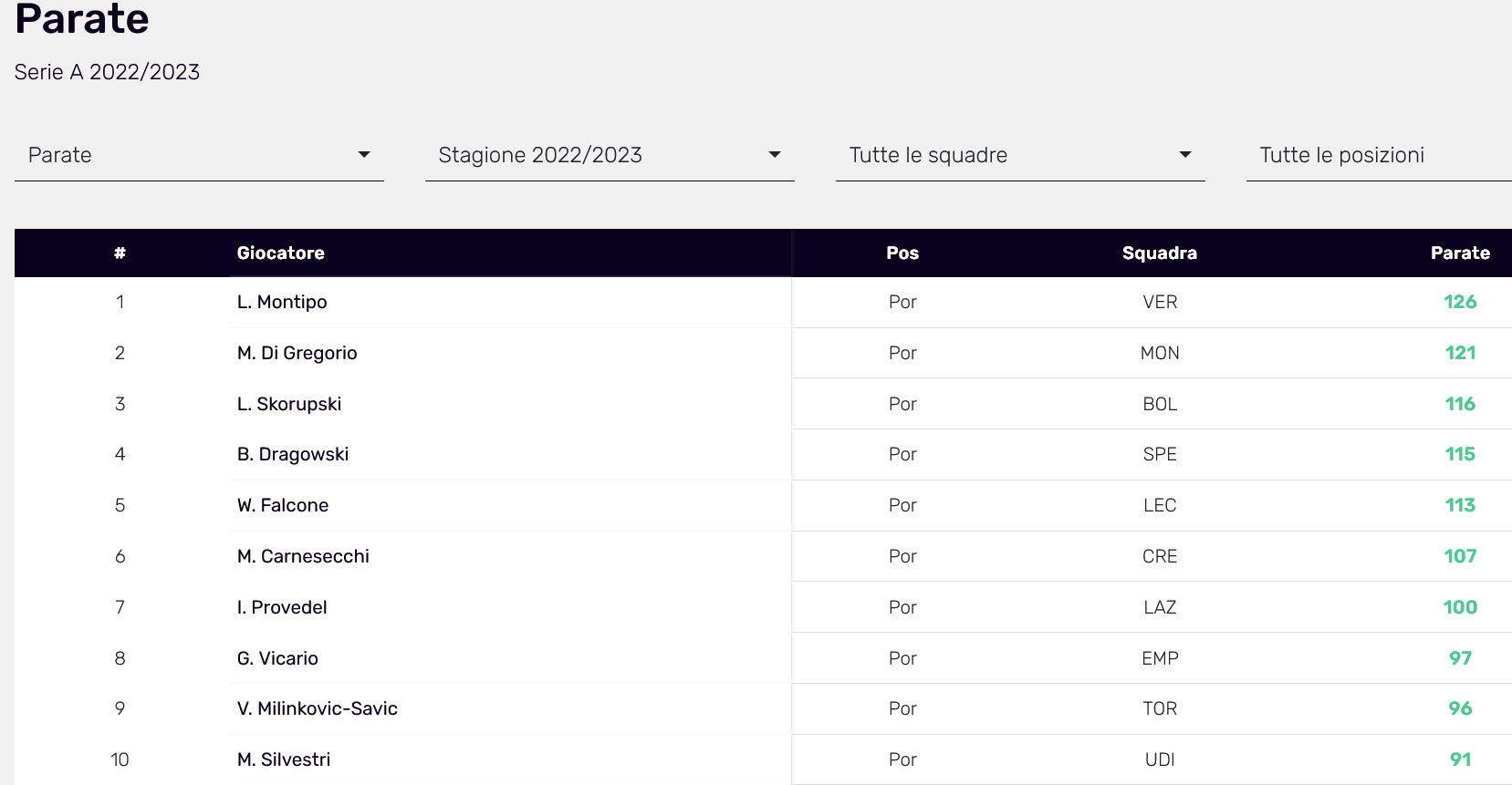 Come puoi ben vedere, a parte Provedel, gli altri portieri sono tutti di squadre di metà-bassa classifica. Non mi sembra di vedere portieri di squadre di alta classifica. Sicuramente squadre più scarse subiscono più tiri in porta. Altra statistica inutile. Era meglio non avessi pubblicato nulla. Stai peggiorando la situazione…