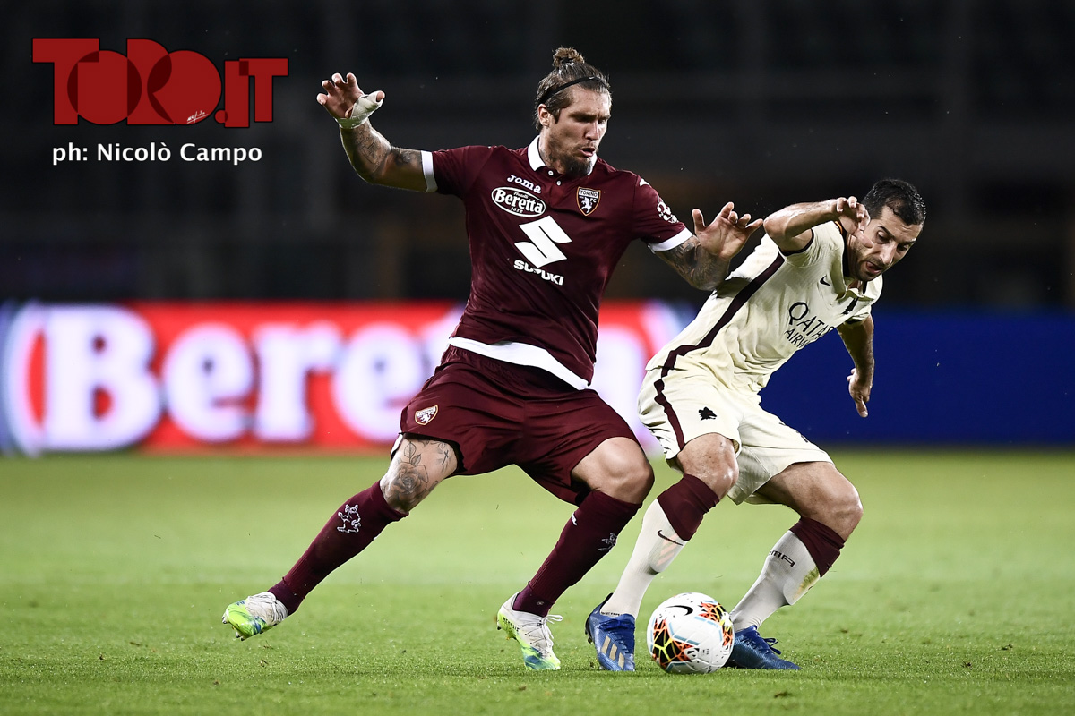 Henrikh Mkhitaryan of AS Roma is challenged by Lyanco of Torino FC during the Serie A football match between Torino FC and AS Roma.