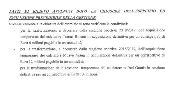 Non fanno parte del bilancio 2017 del Torino, nel senso che non possono essere inseriti nei costi della gestione chiusa il 31 dicembre, ma la società granata ha voluto già rendere nero su bianco come alcuni movimenti economici, ascrivibili al 2018, sono comunque derivati da situazioni precedenti. Quali? Il tema è sempre il calciomercato, e riguarda tre giocatori: Tomas Rincon, Mbaye Niang e Alfred Gomis, con le cifre che sono ora rese chiare del tutto, per essere rendicontate da un lato, analizzate dall’altro.