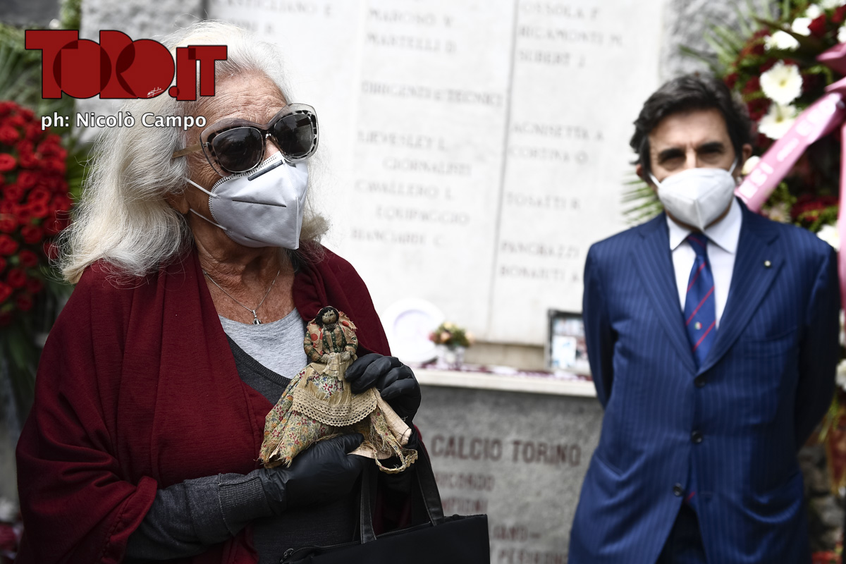 Susanna Egri, daughter of Erno Erbstein, and Urbano Cairo looks on during commemoration of Superga tragedy. On May 4, 1949, an airplane carrying the Grande Torino football team from Lisbon to Turin crashed into a wall of the Basilica of Superga over a hill near Turin killing members of the team. The 71th Annual commemoration of the Superga tragedy is celebrated respecting restrictions imposed by Italian government due COVID-19 coronavirus crisis.