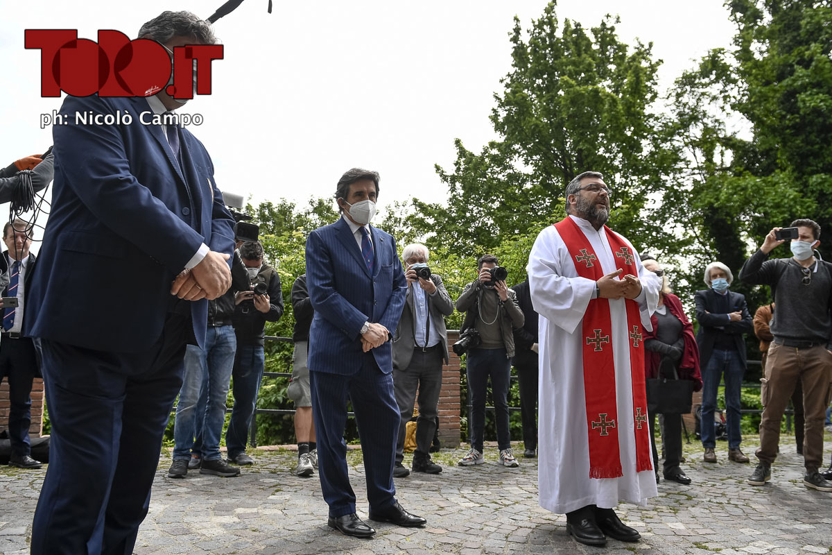 Antonio Comi, Urbano Cairo and Don Riccardo Robella pay tribute to the Grande Torino football team at the monument dedicated to commemorate the tragedy. On May 4, 1949, an airplane carrying the Grande Torino football team from Lisbon to Turin crashed into a wall of the Basilica of Superga over a hill near Turin killing members of the team. The 71th Annual commemoration of the Superga tragedy is celebrated respecting restrictions imposed by Italian government due COVID-19 coronavirus crisis.pay tribute to the Grande Torino football team at the monument dedicated to commemorate the tragedy. On May 4, 1949, an airplane carrying the Grande Torino football team from Lisbon to Turin crashed into a wall of the Basilica of Superga over a hill near Turin killing members of the team. The 71th Annual commemoration of the Superga tragedy is celebrated respecting restrictions imposed by Italian government due COVID-19 coronavirus crisis.
