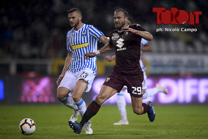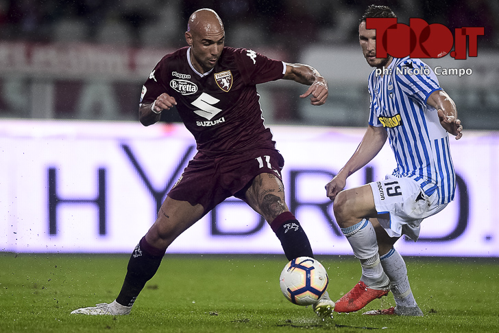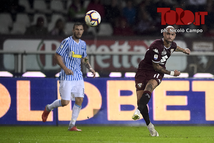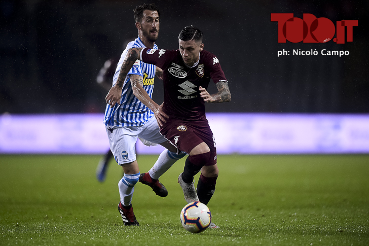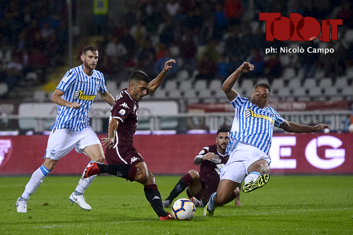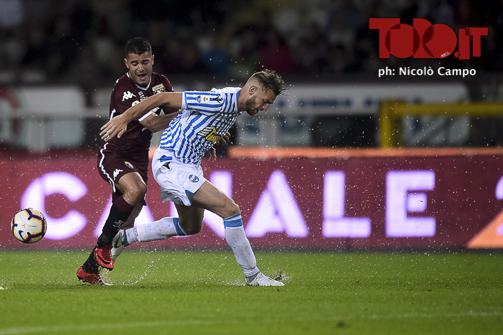 Iago Falque of Torino FC and Francesco Vicari of Spal compete for the ball during the Serie A football match between Torino FC and Spal.