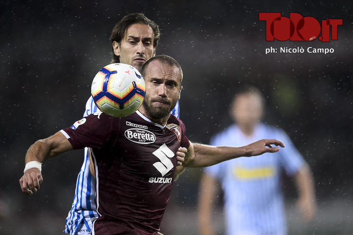 Simone Zaza of Torino FC competes for the ball with Jasmin Kurtic of Spal during the Serie A football match between Torino FC and Spal.