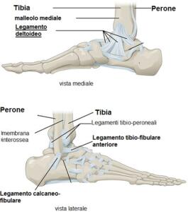 La caviglia è l’articolazione che unisce la gamba al piede, in particolare la tibia e il perone alle ossa astragaliche. I malleoli mediale e laterale, rispettivamente di tibia e perone (o fibula), e la superficie caudale della tibia si articolano con le faccette articolari dell’astragalo. I movimenti concessi sono quelli di flessione ed estensione del piede ma non quelli di rotazione. L’articolazione è composta e rinforzata da legamenti: il legamento deltoideo o mediale e i legamenti laterali. I laterali sono tre legamenti separati che uniscono il malleolo fibulare al talo (talo-fibulare anteriore e posteriore) e al calcagno (calcaneo-fibulare). Il legamento mediale o deltoideo è composto da quattro fasci : legamento tibio-astragalico anteriore, tibio-astragalico posteriore, tibio-navicolare e tibio-calcaneare.