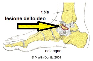Insieme all’azione di stabilizzazione esercitata dai legamenti vi è la presenza dei tendini che collegano i muscoli alle ossa dando così ad all’articolazione la possibilitĂ  del movimento. Tra i tendini il piĂą importante è il tendine d’Achille che collega i muscoli del polpaccio all’ osso calcaneare. I traumi piĂą comuni che colpiscono la caviglia sono le distorsioni, ovvero movimenti anomali ed abnormi non fisiologici che provocano uno stiramento o una rottura dei legamenti e, nei casi piĂą gravi, anche lesioni ossee. Le distorsioni di caviglia rappresentano il 20-30% dei traumi sportivi e sono un evento particolarmente frequente in sport come il calcio dove corsa, salti, impatti con il pallone, contrasti e terreni non regolari sono parte integrante della quotidianitĂ  dell’atleta. La lesione del legamento deltoideo avviene in seguito a una distorsione in eversione del piede, evento traumatico meno frequente rispetto alla distorsione in inversione che danneggia solitamente il comparto laterale.