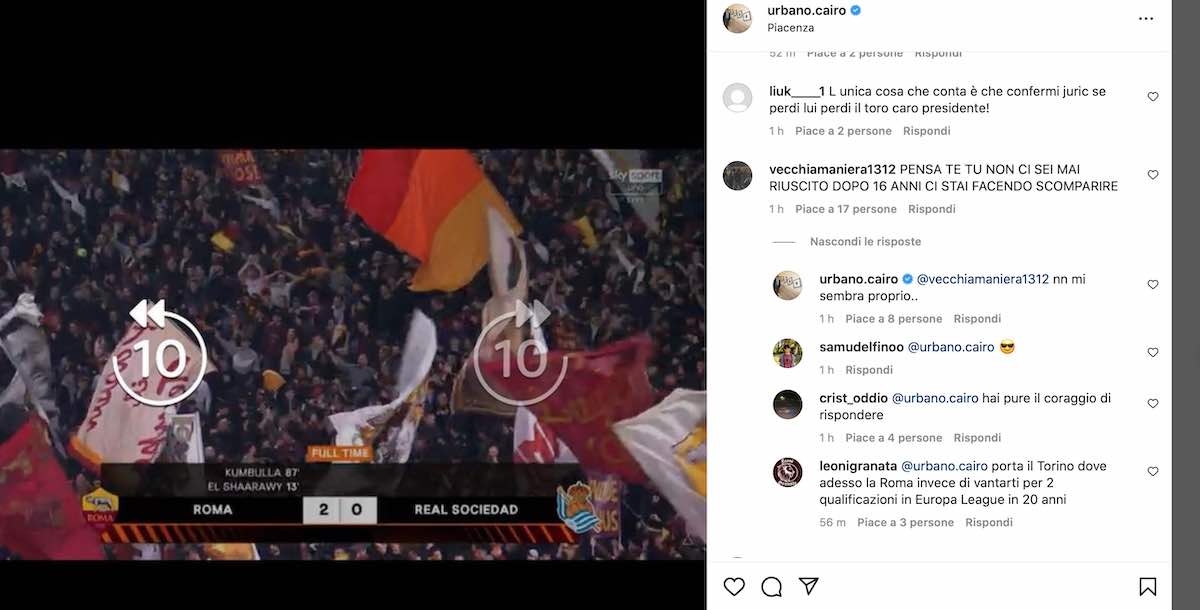 Botta e risposta su Instagram tra Cairo e i tifosi. “Porto fortuna alla Roma” e da lì si scatenano i granata