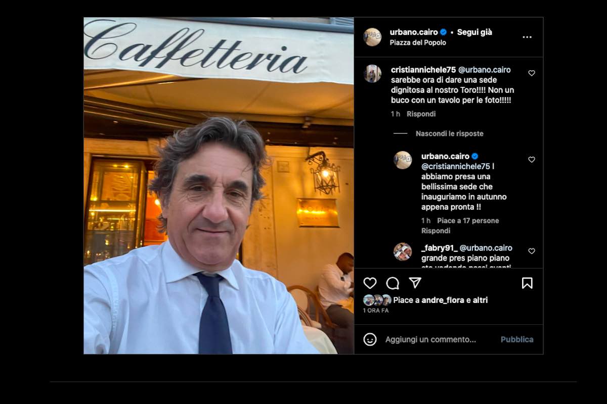 Annuncio a sorpresa da parte del presidente del Torino Urbano Cairo su Instagram. Rispondendo a un tifoso, ha scritto: “Abbiamo preso una bellissima sede che inauguriamo in autunno appena pronta”.