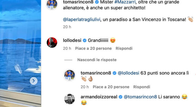 Tomas Rincon, ex giocatore del Torino attualmente alla Sampodoria, è andato a trovare Walter Mazzarri nel suo nuovo agriturismo a San Vincenzo in Toscana. Lorenzo De Silvestri ha commentato con un semplice apprezzamento verso i due, mentre Rincon e Armando Izzo hanno fatto capire che ancora nessuno ha fatto meglio di loro. Infatti Rincon ha scritto: “63 punti sono ancora lì” e Izzo ha risposto “Lì saranno” con tanto di faccine che ridono. Un frecciata a Ivan Juric che sa anche di gufata, che non augura del bene al Toro. Di seguito il post su Instagram in questione.