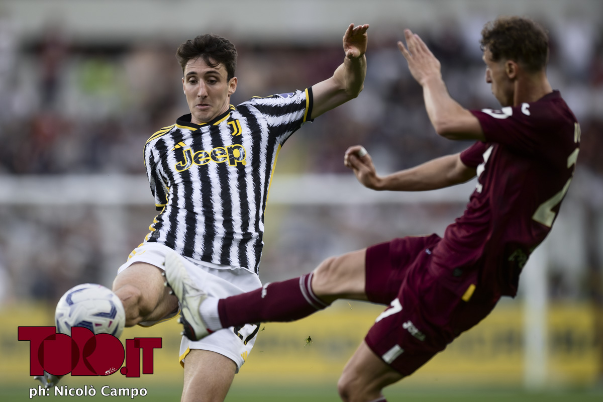 Andrea Cambiaso of Juventus FC competes for the ball with Mergim Vojvoda of Torino FC during the Serie A football match between Torino FC and Juventus FC.