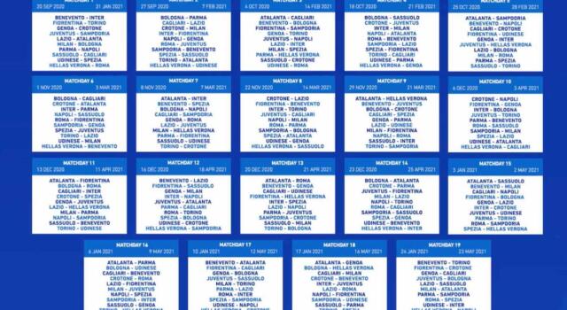 L’inizio della nuova stagione di Serie A si avvicina sempre di più. Con il campionato chiusosi per la prima volta ad agosto a causa del coronavirus e con la questione Europei da gestire, ci sarà qualche variazione rispetto al solito. La partenza è prevista infatti per il 19 settembre, con la Serie A 2020-2021 che si chiuderà il 23 maggio. Sarà un anno ricco di turni infrasettimanali: ne sono previsti 5 totali (16 dicembre 2020, 23 dicembre 2020, 3 febbraio 2021, 21 aprile 2021, 12 maggio 2021), con in aggiunta anche quello del 6 gennaio, per evitare ritardi che potrebbero compromettere l’avventura degli Azzurri ad Euro2021. Le soste previste coinvolgono invece i week end dell’11 ottobre 2020, il 15 novembre 2020 ed il 28 marzo 2021.
