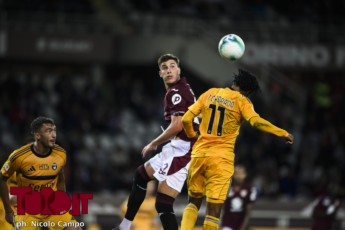 Cesare Casadei of Torino FC competes for a header with Juan Cuadrado of Pisa SC during the Coppa Italia football match between Torino FC and Pisa SC.