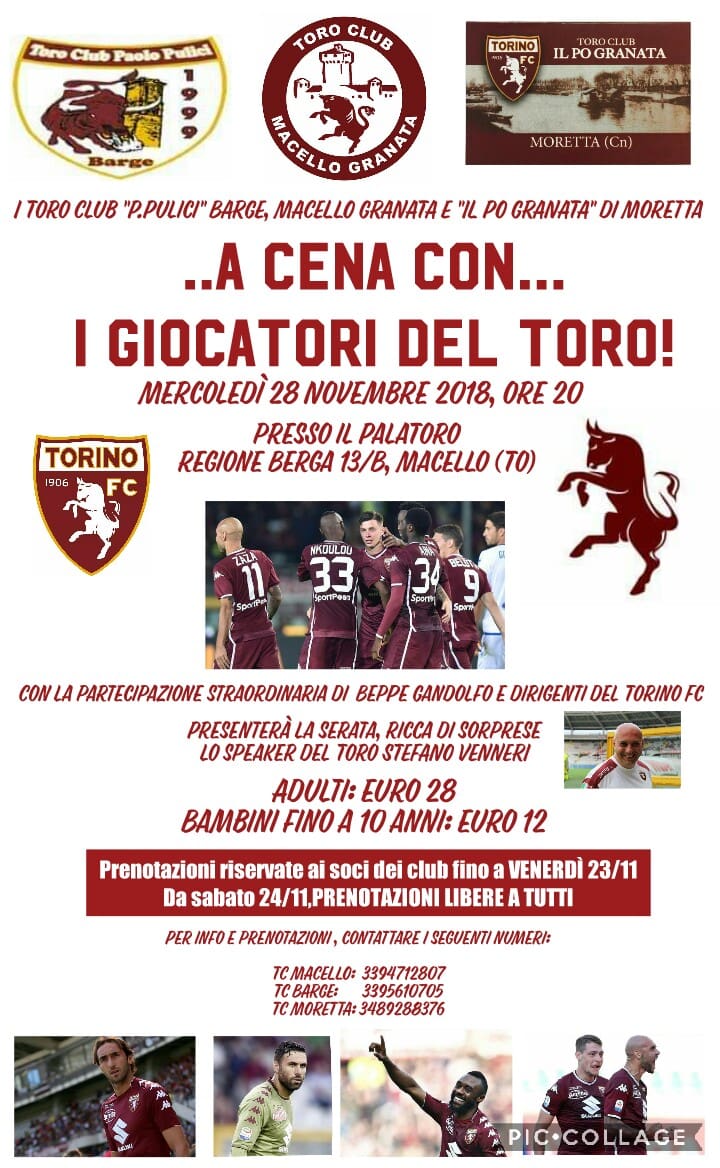 Mercoledì 28 novembre 2018 siete tutti invitati alla serata organizzata dai Toro Club “Paolo Pulici” di Barge, “Macello Granata” e “Il Po Granata” di Moretta. Una serata ovviamente a tinte esclusivamente granata a cui parteciperanno alcuni giocatori del Torino accompagnati dai dirigenti della società nonché alcune personalità legate al mondo del Toro, come Beppe Gandolfo e lo speaker Stefano Venneri a cui sarà affidata la presentazione dell’evento. L’appuntamento, imperdibile, è dunque per mercoledì 28 novembre alle ore 20 presso il Palatoro di Macello. Per tutte le informazioni su costi e prenotazioni potete fare riferimento alla locandina ufficiale posta in calce all’articolo.