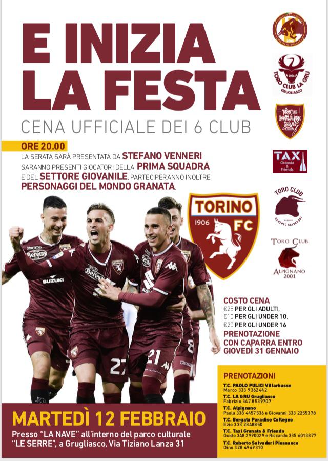 Per tutti coloro che vorranno prendere parte ad una serata a tinte granata, il costo sarĂ di 25 euro (20 euro per gli Under 16 e 10 euro per gli Under 10). Appuntamento a Grugliasco presso il ristorante “La Nave”, alle 20 di martedì 12 febbraio 2019