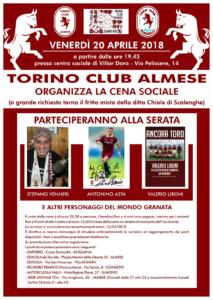 Si terrà il 20 aprile prossimo la cena sociale del Toro Club Almese. Appuntamento alle ore 19.45 presso il centro sociale di Villar Dora, in via Pelissere 14. Ricco il parterre di ospiti: prenderanno parte alla serata Antonino Asta, Stefano Venneri e Valerio Liboni, assieme ad altri personaggi del mondo granata. Il costo della cena è di 30 euro a persona, gratis per i bambini fino ai 4 anni e a metà prezzo per i bimbi fino ai 9 anni. Le iscrizioni resteranno aperte sino al 16 aprile 2018 o fino ad esaurimento posti. Di seguito la locandina della cena sociale, corredata dall’elenco dei punti nei quali è possibile prenotarsi alla serata.
