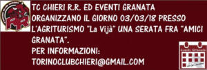 Il Toro Club Chieri, insieme ad Eventi Granata, organizzano una serata tra “Amici Granata”. L’evento si terrà il 3 marzo prossimo presso l’agriturismo “La Vijà” di Chieri. Saranno presenti personaggi dell’universo granata, per una serata speciale nel segno del Toro. Per informazioni e prenotazioni scrivere a torinoclubchieri@gmail.com. Di seguito la locandina dell’evento.