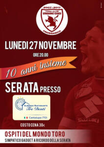 Il Toro Club Ermanno Eandi di Frossasco compie 10 anni e festeggia il compleanno con una cena in programma il 27 novembre