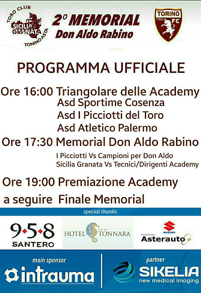 Il Memorial sarà preceduto da una esibizione dei giovani campioncini granata iscritti alle società sportive affiliate alle Academy del Torino Fc. Parteciperanno l’Asd “Sportime” di Cosenza, l’Asd “I picciotti del Toro” e l’Asd “Atletico Palermo”. A premiare i giovani atleti sarà la Signora Annamaria Rabino. L’appuntamento è fissato dalle ore 16 presso gli impianti della Polisportiva Calcio Sicilia siti in Via La Loggia a Palermo. Al termine della manifestazione agonistica si terrà la cena di gala su prenotazione. #