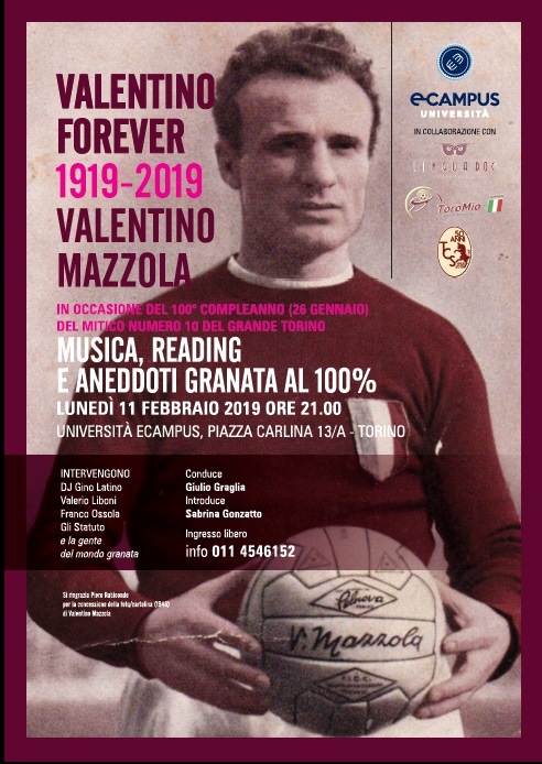 Appuntamento in piazza Carlina 13/A a Torino, l’11 febbraio prossimo alle ore 21. In programma l’evento “Valentino Forever”, dedicato ai 100 anni di Capitan Mazzola, anima e guida del Grande Torino, organizzato dall’Università eCampus in collaborazione con ToroMio e l’associazione Lingua DOC. Musica, letture e aneddoti tutti granata nel ricordo di Valentino; e gli ospiti saranno numerosi e illustri: dal dj Gino Latino a Valerio Liboni, passando per Gli Statuto e Franco Ossola. Introdurrà la serata, condotta da Giulio Graglia, Sabrina Gonzatto. L’ingresso sarà libero.