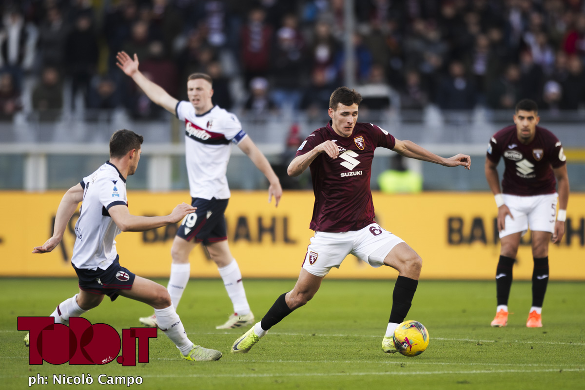 Gvidas Gineitis of Torino FC is challenged by Remo Freuler and Lewis Ferguson of Bologna FC during the Serie A football match between Torino FC and Bologna FC.