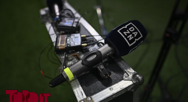 A microphone bearing the logo of DAZN is seen prior to the Serie A football match between Torino FC and AS Roma.