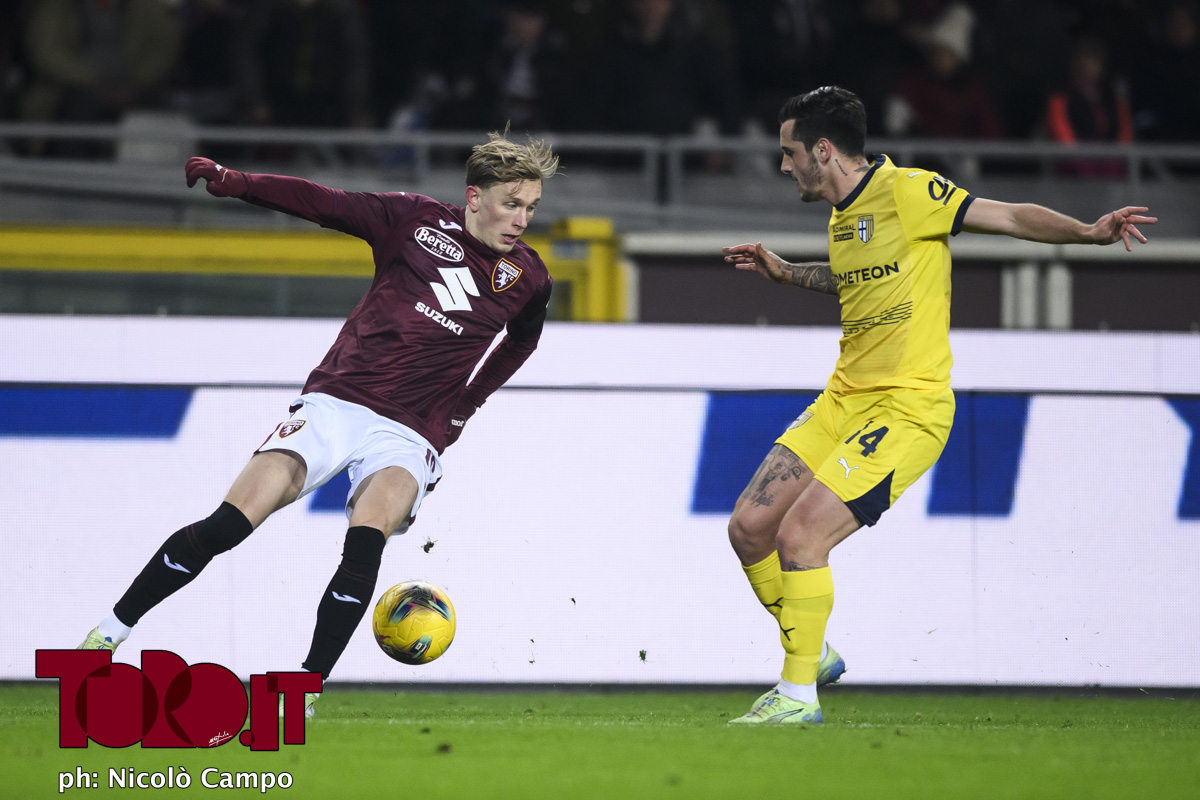 Marcus Pedersen of Torino FC competes for the ball with Emanuele Valeri of Parma Calcio during the Serie A football match between Torino FC and Parma Calcio.
