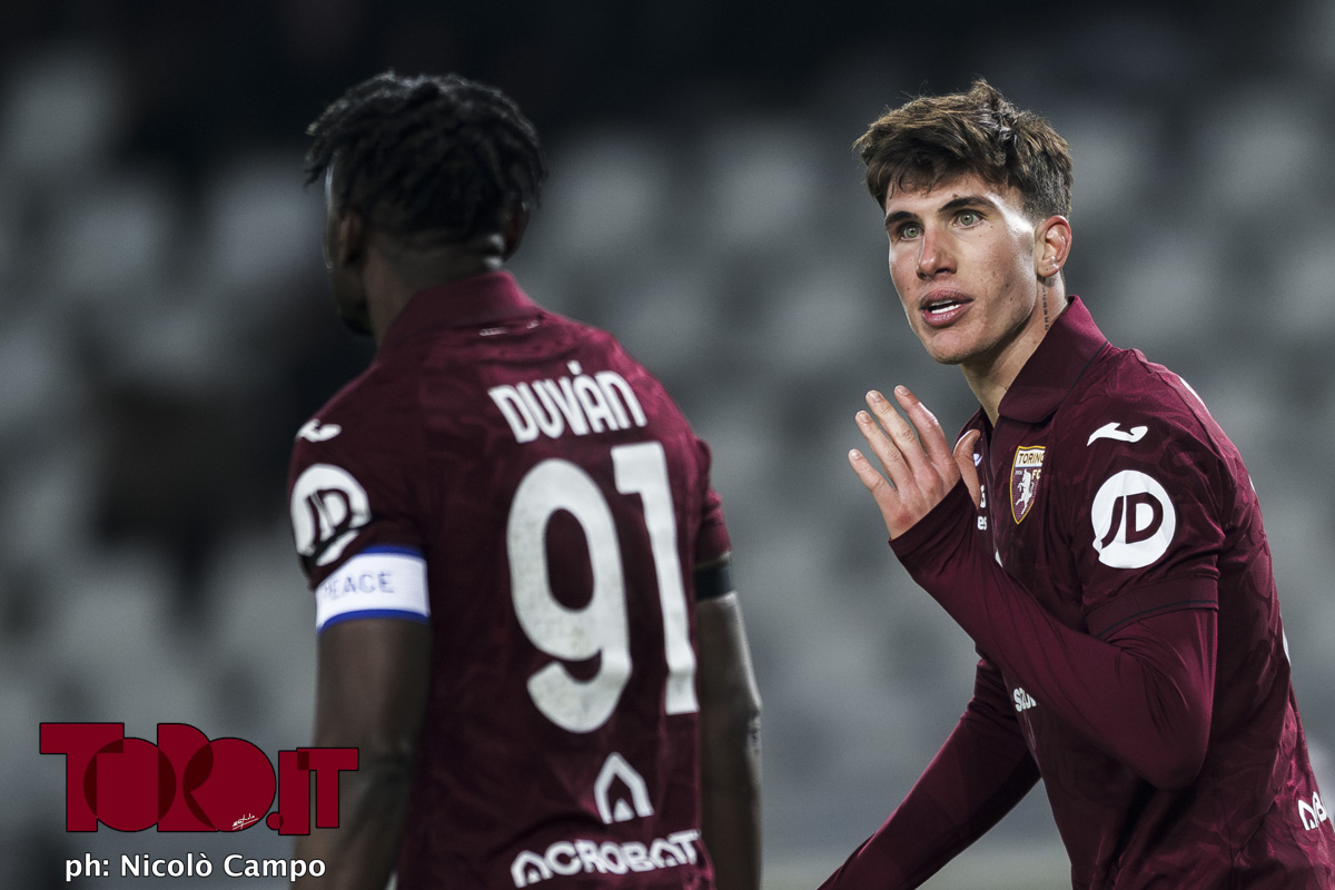 Cesare Casadei of Torino FC reacts next to Duvan Zapata of Torino FC during the Serie A football match between Torino FC and Udinese Calcio.