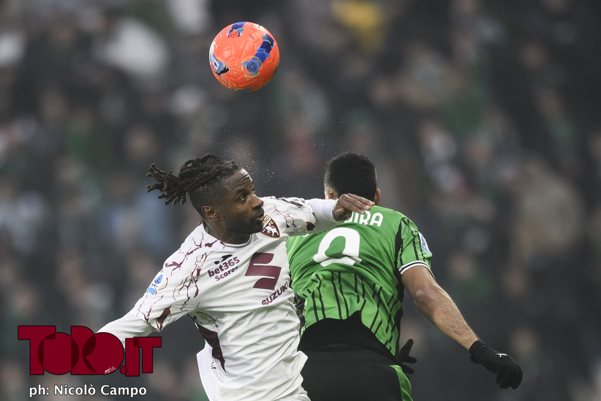 Adrien Tameze of Torino FC competes for a header with Walid Cheddira of US Sassuolo during the Serie A football match between US Sassuolo and Torino FC.