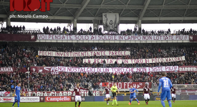 nostro inviato – Uno striscione campeggia in Maratona, mentre le squadre sono in campo per il riscaldamento: “Voi pensate solo ai soldi e in campo non lottate più. Noi nostalgici di un Toro che non esiste più”. Era già stata annunciata la contestazione al Torino prima della sfida col Crotone, poi rinviata: e oggi contro la Fiorentina si preannuncia lo sciopero del tifo granata. I giocatori del Toro sono stati accolti dai fischi, applausi invece per i viola, in campo per il riscaldamento. Durante la lettura delle formazioni, il pubblico non ha partecipato, né ha accolto la squadra con applausi. Sciopero del tifo, come già annunciato: la curva Maratona segue in silenzio la partita del Toro e dallo stadio di sentono solo i tifosi della Fiorentina. Intorno al 20′, altro striscione, stavolta indirizzato alla società: “Pochi investimenti, tante parole. La realtà è un Toro di poco valore”.