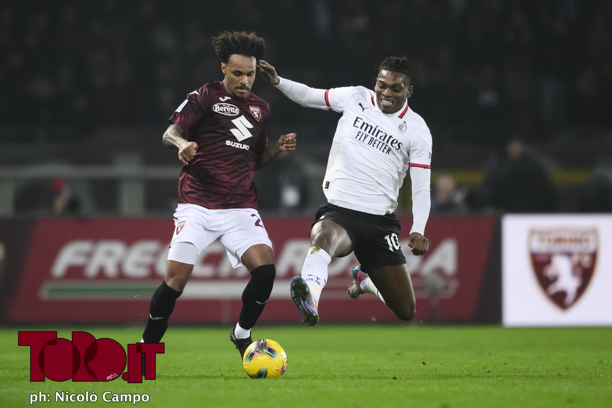 Valentino Lazaro of Torino FC is tackled by Rafael Leao of AC Milan during the Serie A football match between Torino FC and AC Milan.