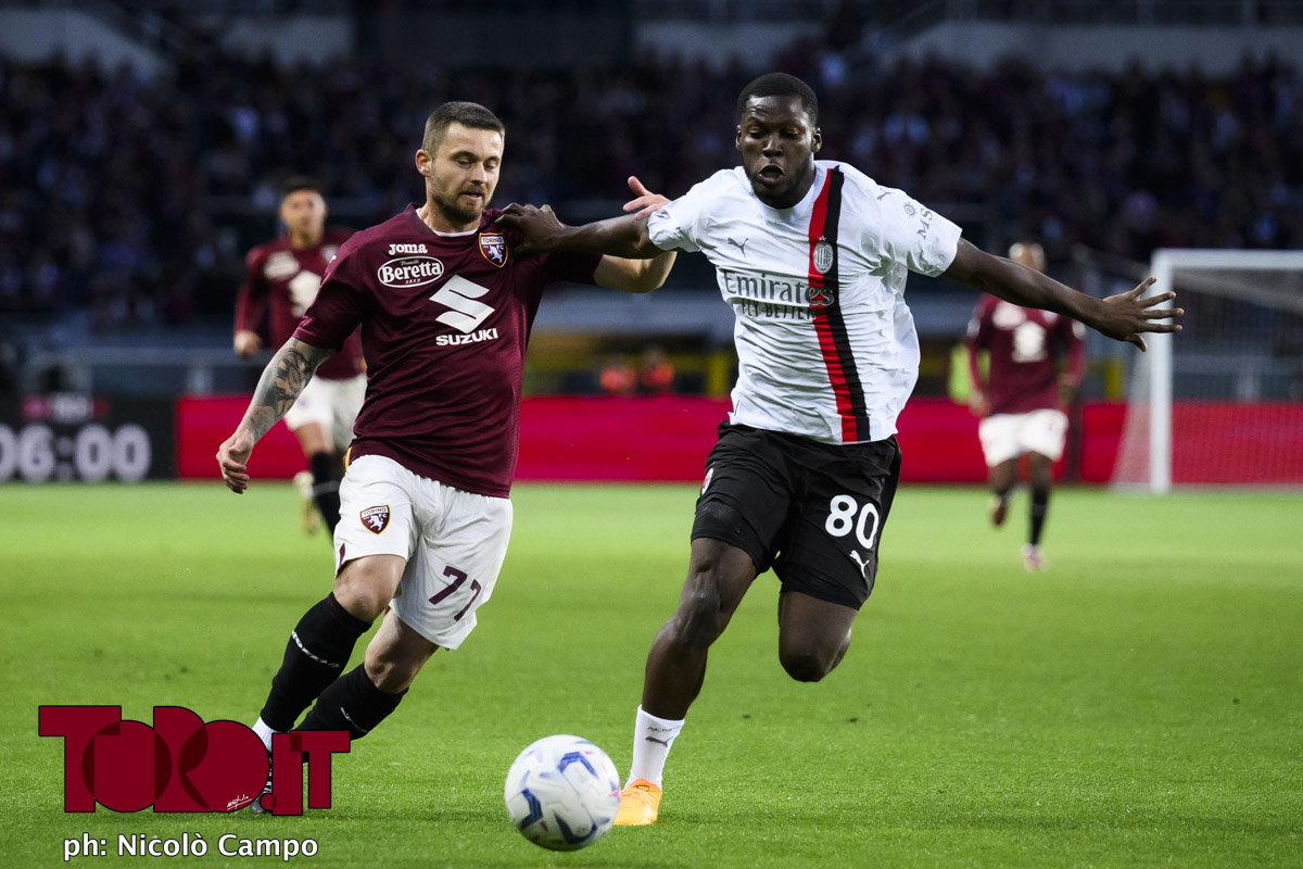 Per la sfida al Milan, ultima in casa e ultima al Grande Torino della gestione Juric, il tecnico si affida alla già annunciata coppia formata da Zapata e da Pellegri. Attacco pesante in una serata in cui i granata hanno l’obiettivo di superare in classifica il Napoli e arrivare al nono posto, nella speranza di mantenerlo e che poi valga effettivamente l’Europa. Fase di studio nei primi minuti di partita. Ci prova Ilic su punizione ma la palla si infrange contro la barriera, poi all’8′ ci prova Pulisic senza inquadrare la porta. Un minuto dopo è invece Milinkovic-Savic a intercettare una conclusione comunque debole dei rossoneri. Al 19′ la prima vera occasione per il Torino: sugli sviluppi di una punizione Tameze, praticamente dal dischetto e tutto solo, spara altissimo. Al 26′ la sblocca il Toro: cambio di gioco di Linetty e dalla sinistra cross di Rodriguez, teso, potente, sulla testa di Zapata. Palloni che sono il pane per i suoi denti e infatti nulla può Sportiello. Torino avanti 1-0. Non finisce qui perché il vantaggio dà ai granata verve in più: un risultato che carica ogni reparto, a partire dalla difesa, con Buongiorno che le prende tutte. E così non stupisce che arrivi anche il raddoppio: Pellegri in mezzo al campo si libera di Bennacer col tacco, poi serve sulla destra Bellanova che crossa per andare a cercare proprio l’attaccante. In area c’è però pure Ilic e la palla del 19 arriva sulla testa del serbo, completamente libero. Non deve nemmeno staccare: colpisce di testa e segna il raddoppio al 40′.