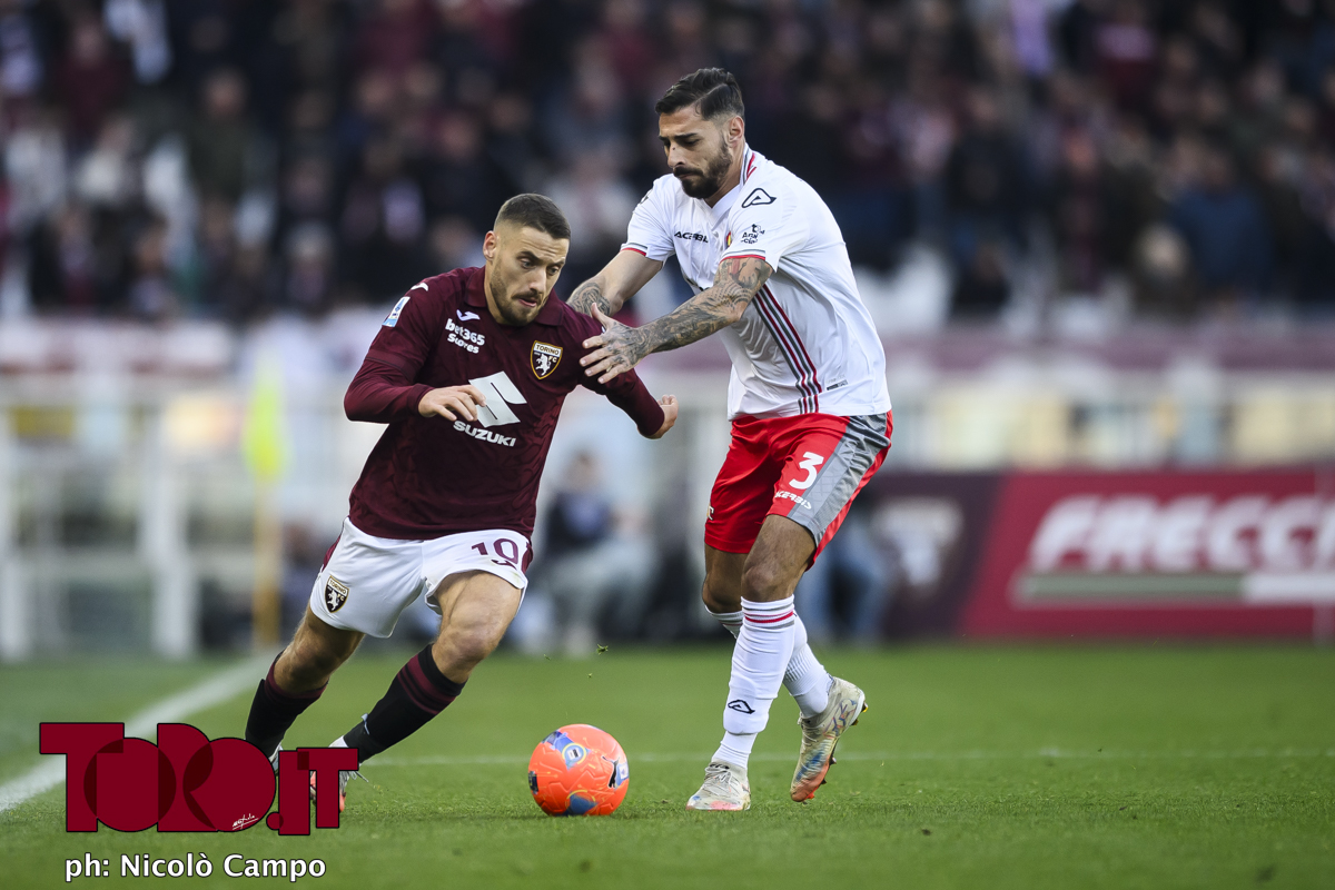 Nikola Vlasic of Torino FC competes with Giuseppe Pezzella of US Cremonese during the Serie A football match between Torino FC and US Cremonese.