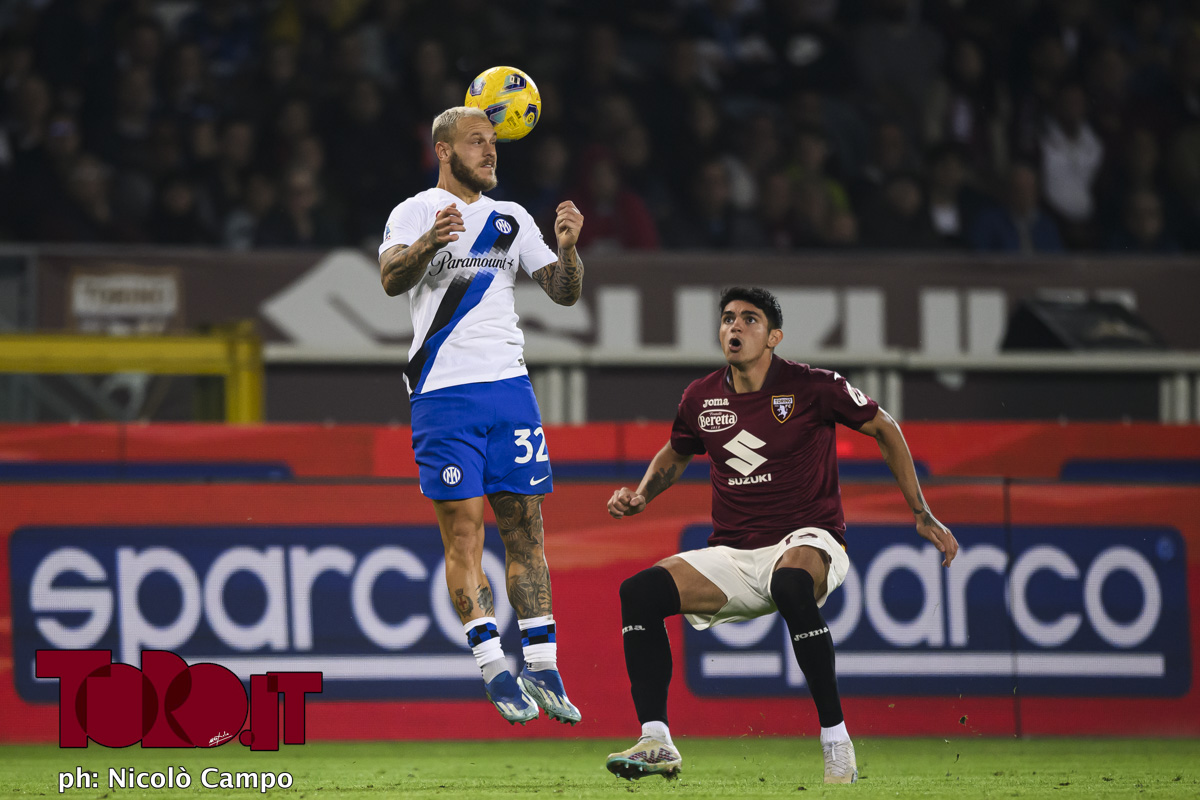Federico Dimarco of FC Internazionale competes for a header with Raoul Bellanova of Torino FC during the Serie A football match between Torino FC and FC Internazionale.
