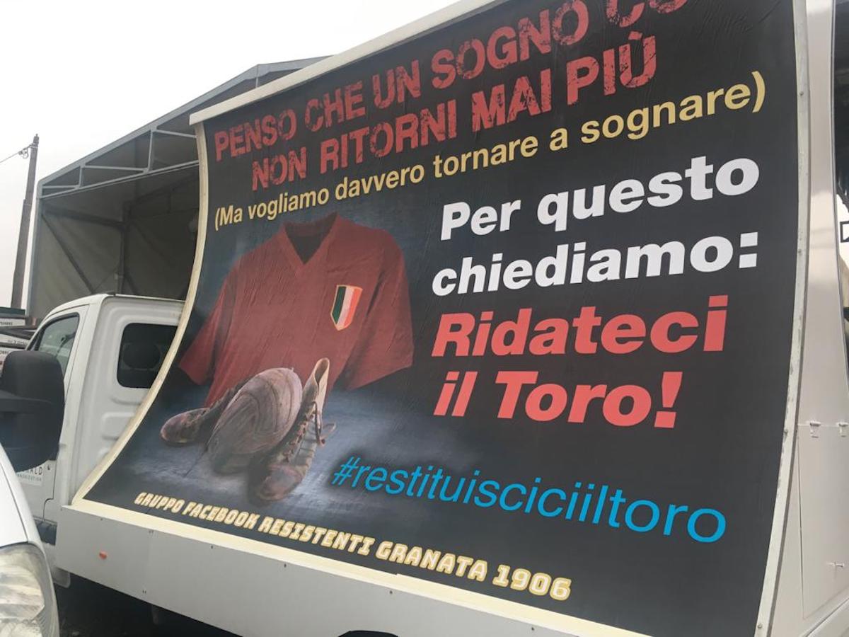 “Penso che un sogno così non ritorni mai più – si legge sul grande cartellone a quattro ruote realizzato grazie al contributo (anche e soprattutto economico) dei tantissimi supporter che hanno risposto all’appello dei “Resistenti Granata”. Una contestazione che prende spunto da quello che forse è l’incipit più famoso della canzone italiana per poi proseguire: “Vogliano tornare a sognare. Per questo chiediamo: ridateci il Toro!“