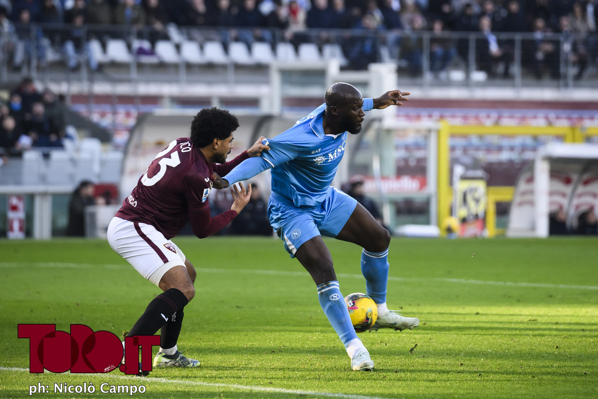 Romelu Lukaku of SC Napoli competes for the ball with Saul Coco of Torino FC during the Serie A football match between Torino FC and SSC Napoli.