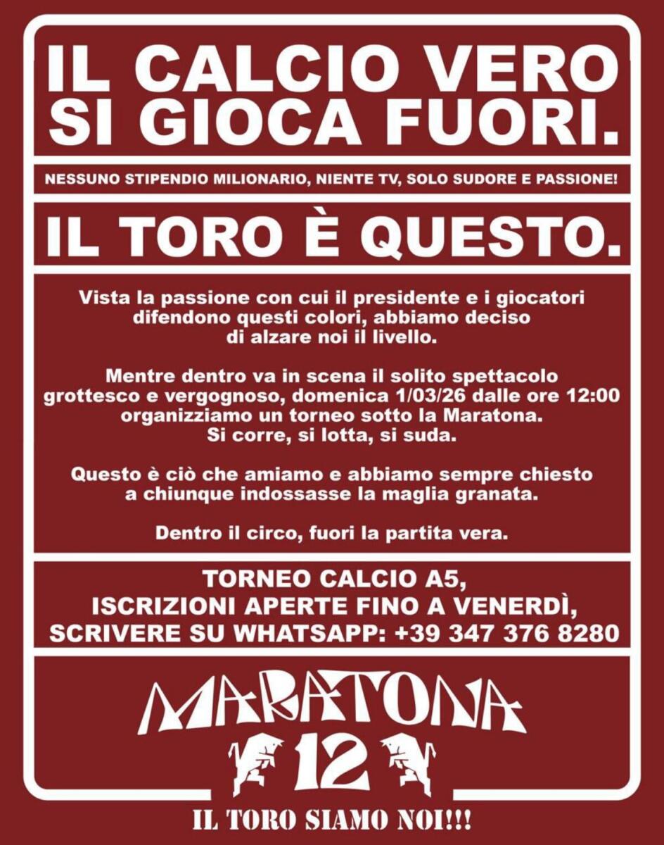 Non solo la curva resterĂ simbolicamente vuota: numerosi tifosi granata si ritroveranno alle ore 12.00 all’esterno dello Stadio Olimpico Grande Torino per disputare un torneo di calcetto, un gesto dal forte valore simbolico per ribadire l’attaccamento ai valori e alla storia del Torino: “Il calcio vero si gioca fuori. Nessuno stipendio milionario, niente tv, solo sudore e passione. Il Toro è questo. Vista la passione con cui il presidente e i giocatori difendono questi colori, abbiamo deciso di alzare noi il livello. Mentre dentro va in scena il solito spettacolo grottesco e vergognoso, domenica 1 marzo 2026 dalle ore 12 organizziamo un torneo sotto la Maratona. Si corre, si lotta, si suda. Questo è ciò che amiamo e abbiamo sempre chiesto a chiunque indossasse la maglia granata. Dentro il circo, fuori la partita vera”.