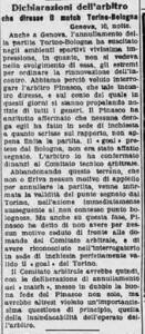 Nonostante le proteste di tutta l’Italia sportiva Arpinati non tornò sulla sua decisione e decise di far ripetere la partita inserendola in calendario prima dell’ultima giornata. Tutti all’epoca si chiesero come fosse possibile che l’arbitro Pinasco avesse cambiato idea sull’episodio del fuorigioco così tanto tempo dopo, un giornalista de La Stampa fece di più e andò a chiedere spiegazioni direttamente al direttore di gara. A questo punto la faccenda diventa ancora più oscura: Pinasco pubblicamente dichiarò di non aver mai presentato alla FIGC nessun documento su un suo ripensamento e ribadì di essere certo sia del fatto che Bosia respinse il pallone sulla linea, sia che il gol di Libonatti fosse regolare. Perché nel 1927 un arbitro avrebbe dovuto contraddire pubblicamente un gerarca fascista con il potere di Arpinati (era anche vicesegretario del PNF)? I colleghi arbitri della Liguria pensarono allora di manifestare la propria solidarietà a Pinasco organizzando un’assemblea ma furono fermati da un telegramma: “Onorevole Arpinati non ammette protesta da parte di arbitri per delibera di enti federali e invita a comunicare che considera dimissionari coloro che parteciperanno a riunione indetta per martedì sera. Sospendete arbitro Pinasco fino a nuovo ordine”. Il nuovo ordine non arrivò mai.