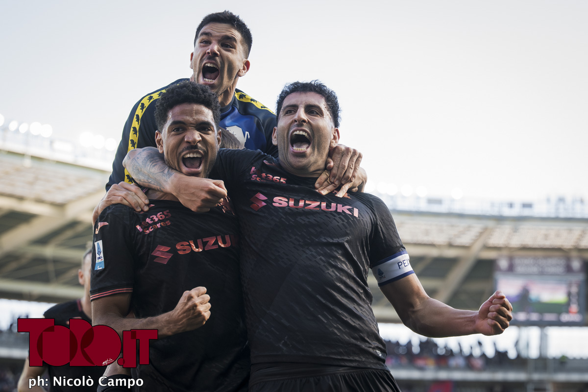 Guillermo Maripan del Torino FC esulta con Saul Coco del Torino FC e Giovanni Simeone del Torino FC dopo aver segnato un gol durante il match di Serie A tra Torino FC e Genoa CFC.