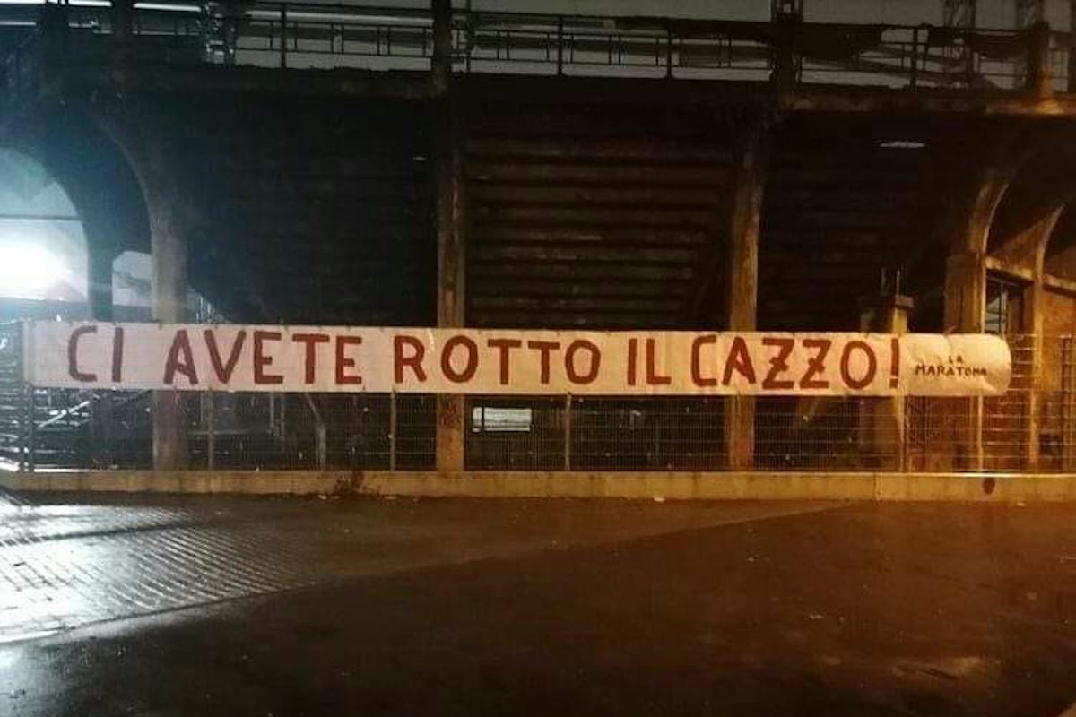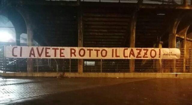 “Ci avete rotto il c…o”. E’ quanto scritto su uno striscione, firmato La Maratona, che è stato appeso in serata al Filadelfia. Poche parole ma che bastano a esprimere il malcontento della tifoseria del Torino, dopo l’ennesimo derby perso e l’ennesima sconfitta in questo inizio di campionato. D’altro canto la rabbia dei tifosi è piĂą che comprensibile, dopo queste prime dieci giornate di campionato in cui la squadra di Marco Giampaolo ha raccolto appena 6 punti e dopo l’ennesimo ko subito per mano della Juventus. Anche se impossibilitati a seguire la squadra allo stadio o nelle sedute di allenamento, per via delle misure anti-Covid, gli ultras del Torino hanno comunque voluto manifestare il proprio dissenso.