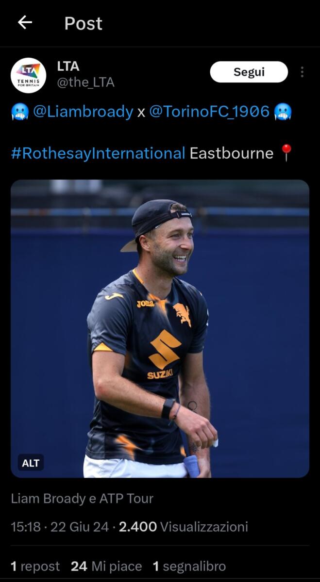 Quest’oggi un altro tennista ha deciso di indossare la maglia del Torino. Non si tratta di uno dei migliori al mondo e nemmeno di un italiano. Il fatto è avvenuto al torneo ATP di Eastbourne, nel Regno Unito. Con il tennista Liam Broady che indossava la terza maglia della stagione 2023-2024, nera con sfumature arancioni.
