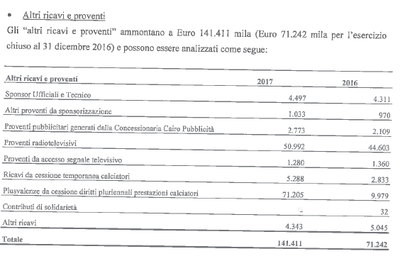 La seconda parte dell’analisi del bilancio 2017 del Torino riguarda non più i ricavi derivati dalle sole plusvalenze, ma anche da tutte le altre importanti e significative voci che sono state contabilizzate nell’esercizio dello scorso anno solare. E anche in questo caso, se il calciomercato va a rimpinguare delle casse che per il quinto anno consecutivo registrano un utile (cosa assai rara, nel mondo del calcio), si può notare come i proventi siano in aumento anche per altri aspetti. Su tutti, la pubblicità e i diritti TV. Come riportato infatti nella nota del bilancio stesso, al punto 8.1, viene sottolineato che proprio le plusvalenze abbiano portato a un aumento significativo del valore della produzione (vale a dire il fatturato), ma che queste non siano state le uniche: si registra un incremento del 14% dei diritti audiovisivi (50,9 milioni di euro contro i 44,6 del 2016) e dell’incremento dei proventi commerciali del 6%.