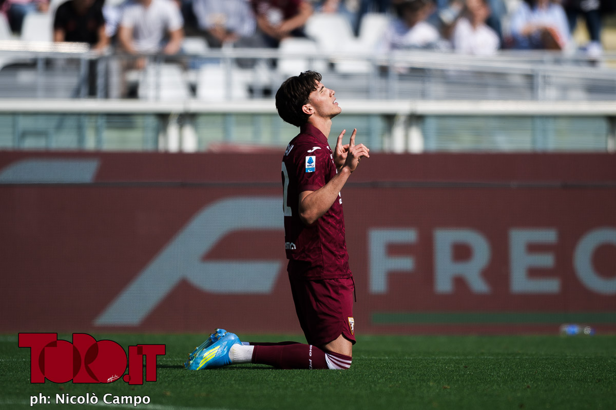 Cesare Casadei of Torino FC celebrates after scoring a goal during the Serie A football match between Torino FC and Hellas Verona FC.
