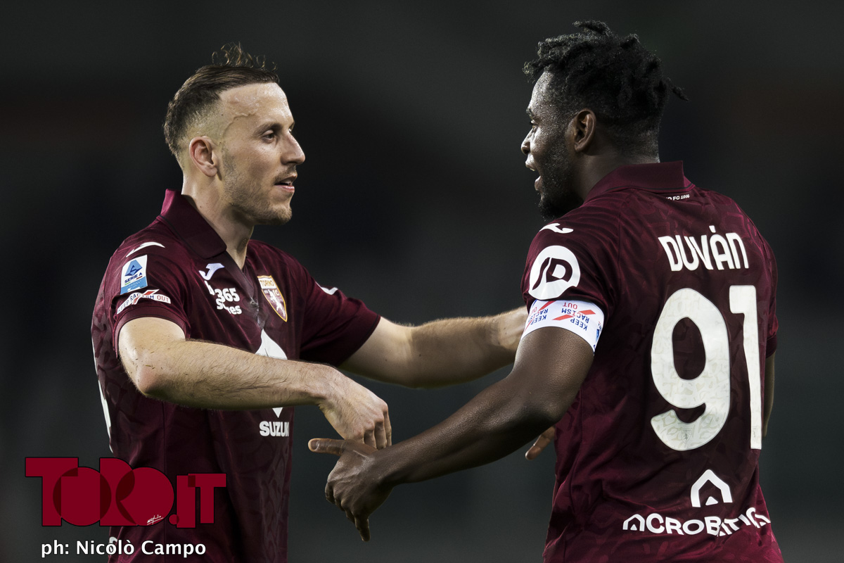 Duvan Zapata of Torino FC celebrates with Ardian Ismajli of Torino FC after scoring a goal during the Serie A football match between Torino FC and Parma Calcio.