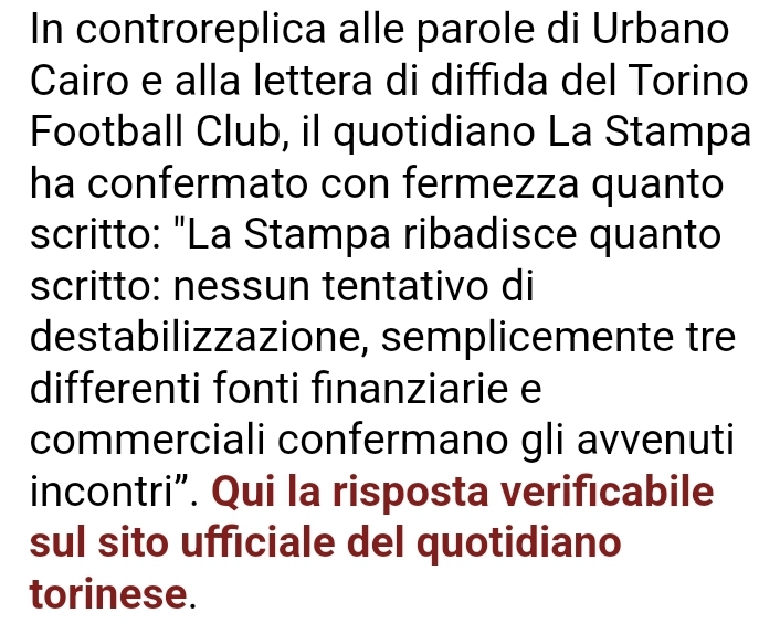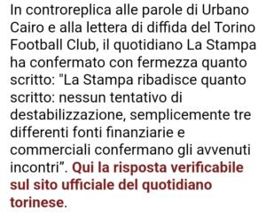 Caro Cairo La Stampa ha confermato la notizia..il tuo castello di carte si sta sgretolando…ormai più nessuno crede alle tue menzogne….VATTENE IL TUO TEMPO E FINITO