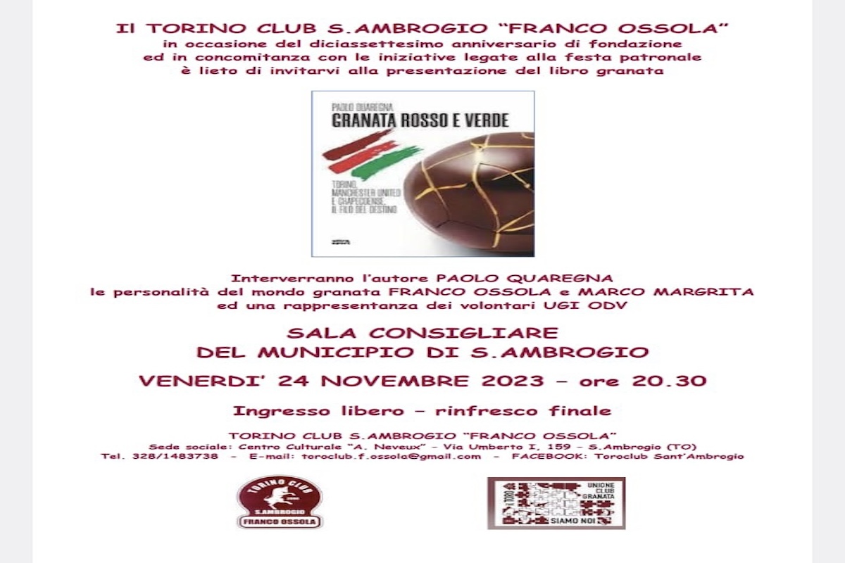 Il Torino Club “Franco Ossola” di Sant’Ambrogio, organizza la presentazione del libro “Granata rosso e verde” di Paolo Quaregna. Appuntamento a venerdì 24 novembre alle ore 20:30, presso la Sala Consigliare del Municipio di Sant’Ambrogio. Ingresso libero e rinfresco finale. Di seguito la locandina con tutte le informazioni utili.